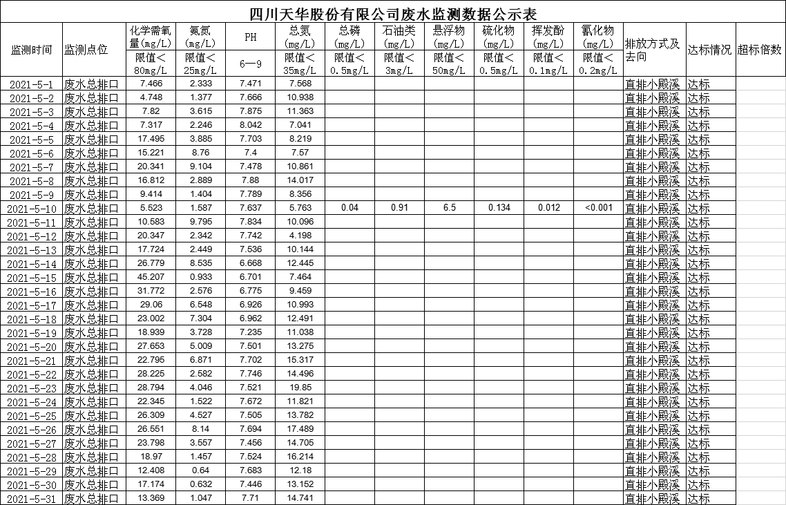 四川天華股份有限公司5月廢水監測數據公示