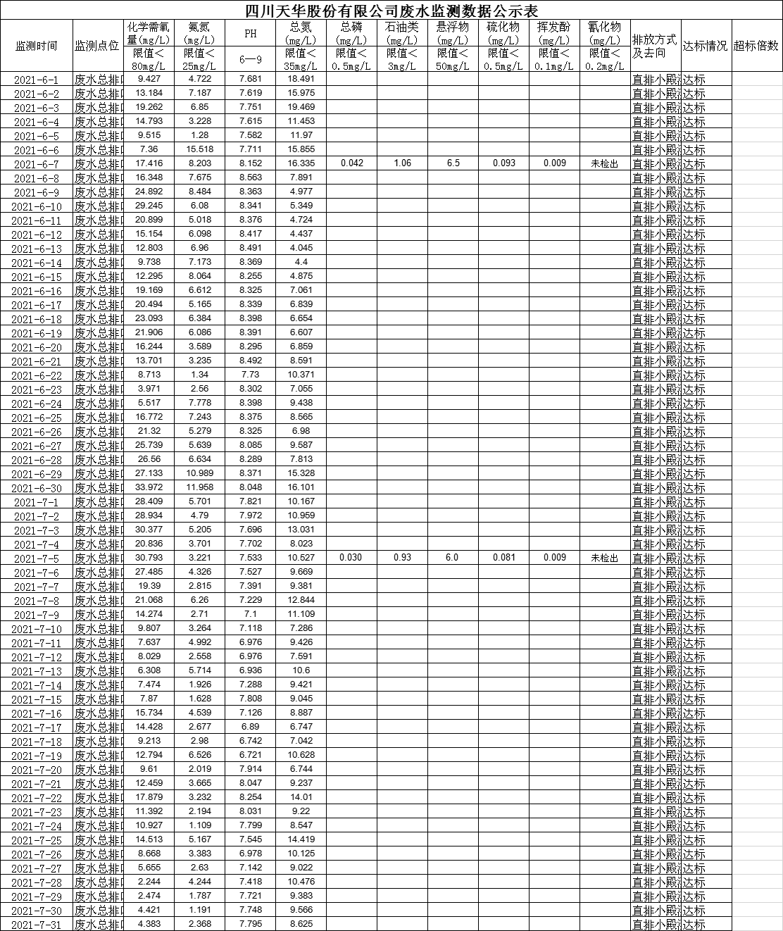 四川天華股份有限公司6月、7月廢水監(jiān)測(cè)數(shù)據(jù)公示