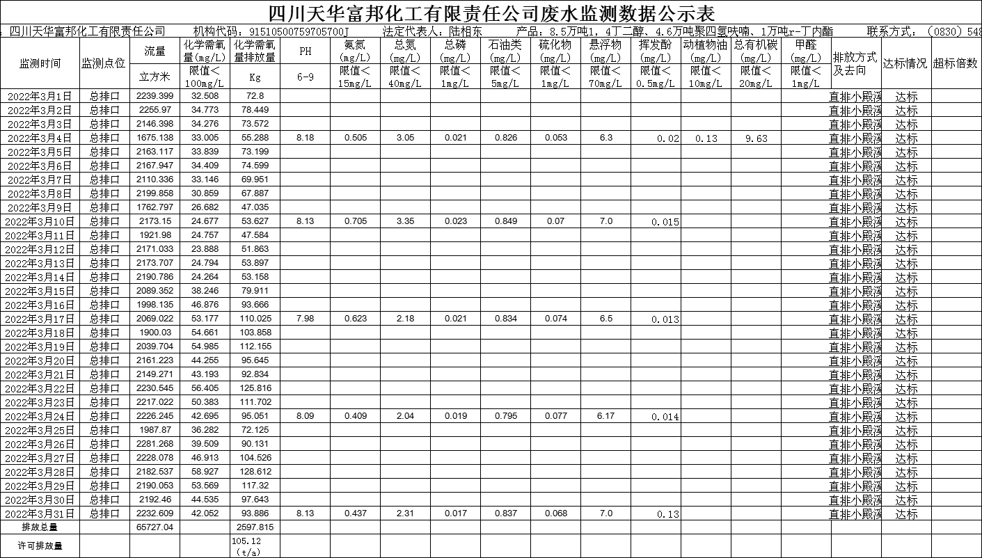 四川天華富邦化工有限責任公司2022年3月廢水監測數據公示
